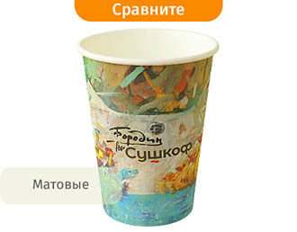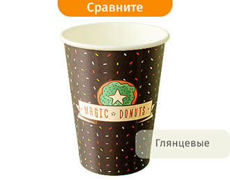 Матовые стаканчики изготавливают из плотного немелованного картона с нанесением на внутреннюю поверхность полимерного защитного слоя. При печати на них все цвета выглядят немного приглушенно. Такие стаканчики стильно выглядят и приятны на ощупь.