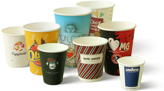 матовые, глянцевые, для горячих или холодных напитков, с нанесением логотипа малым тиражом за 3 дня, готовые со стандартным дизайном со склада, а также сопутствующие товары - крышки разных цветов, капхолдеры с печатью и без печати, палочки для размешивания, трубочки.