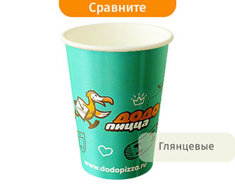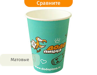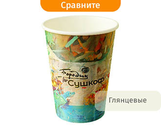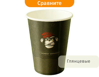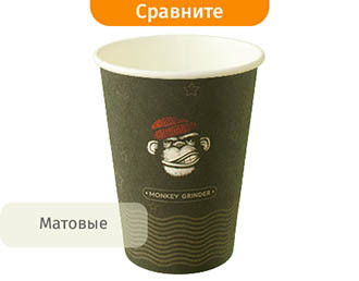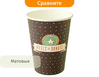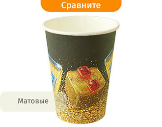 Матовые стаканчики изготавливают из плотного немелованного картона с нанесением на внутреннюю поверхность полимерного защитного слоя. При печати на них все цвета выглядят немного приглушенно. Такие стаканчики стильно выглядят и приятны на ощупь.