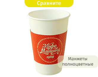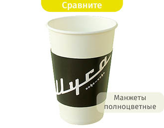 Полноцветные манжеты изготавливают из качественного одностороннего мелованного картона. На них офсетным способом наносится изображение любой сложности. Они дают хорошую термоизоляцию и выглядят очень ярко, привлекая внимание клиентов.